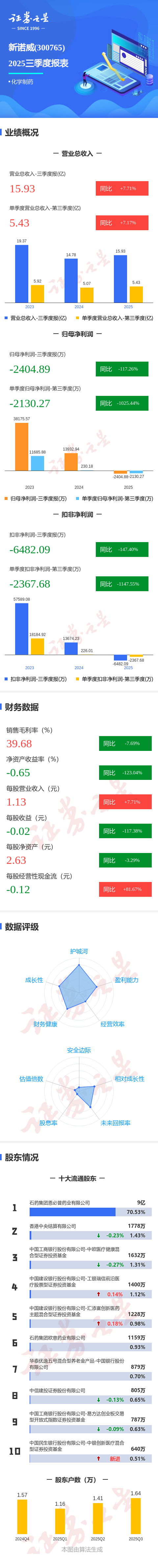 证券之星消息,新诺威2025年三季报显示,公司主营收入15.93亿元,同比上升7.71%;归母净利润-2404.89万元,同比下降117.26%;扣非净利润-6482.09万元,同比下降147.4%;其中2025年第三季度,公司单季度主营收入5.43亿元,同比上升7.18%;单季度归母净利润-2130.27万元,同比下降1025.45%;单季度扣非净利润-2367.68万元,同比下降1147.56%;负债率32.94%,投资收益-843.37万元,财务费用-2054.51万元,毛利率39.68%。