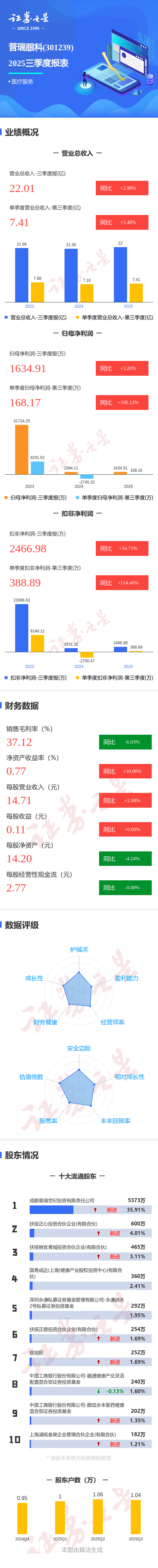 证券之星消息,普瑞眼科2025年三季报显示,公司主营收入22.01亿元,同比上升2.99%;归母净利润1634.91万元,同比上升3.21%;扣非净利润2466.98万元,同比上升34.71%;其中2025年第三季度,公司单季度主营收入7.41亿元,同比上升3.48%;单季度归母净利润168.17万元,同比上升106.13%;单季度扣非净利润388.89万元,同比上升114.4%;负债率53.52%,投资收益-252.31万元,财务费用6589.6万元,毛利率37.12%。