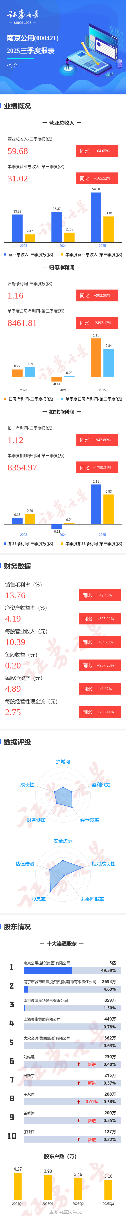 证券之星消息,南京公用2025年三季报显示,公司主营收入59.68亿元,同比上升64.06%;归母净利润1.16亿元,同比上升903.99%;扣非净利润1.12亿元,同比上升942.8%;其中2025年第三季度,公司单季度主营收入31.02亿元,同比上升165.53%;单季度归母净利润8461.81万元,同比上升2492.12%;单季度扣非净利润8354.97万元,同比上升1759.31%;负债率62.13%,投资收益1219.44万元,财务费用3929.67万元,毛利率13.76%。