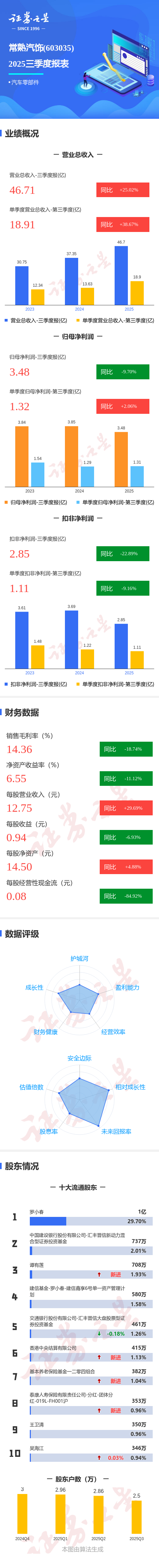 证券之星消息,常熟汽饰2025年三季报显示,公司主营收入46.71亿元,同比上升25.03%;归母净利润3.48亿元,同比下降9.7%;扣非净利润2.85亿元,同比下降22.9%;其中2025年第三季度,公司单季度主营收入18.91亿元,同比上升38.67%;单季度归母净利润1.32亿元,同比上升2.07%;单季度扣非净利润1.11亿元,同比下降9.16%;负债率53.83%,投资收益1.54亿元,财务费用3465.2万元,毛利率14.36%。