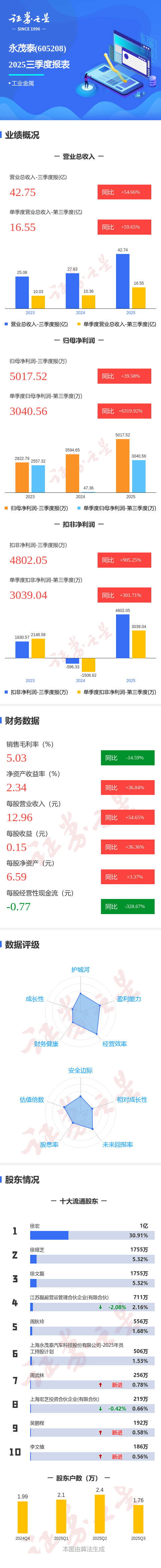 证券之星消息,永茂泰2025年三季报显示,公司主营收入42.75亿元,同比上升54.66%;归母净利润5017.52万元,同比上升39.58%;扣非净利润4802.05万元,同比上升905.26%;其中2025年第三季度,公司单季度主营收入16.55亿元,同比上升59.65%;单季度归母净利润3040.56万元,同比上升6319.92%;单季度扣非净利润3039.04万元,同比上升301.71%;负债率53.83%,投资收益-978.98万元,财务费用2737.81万元,毛利率5.03%。