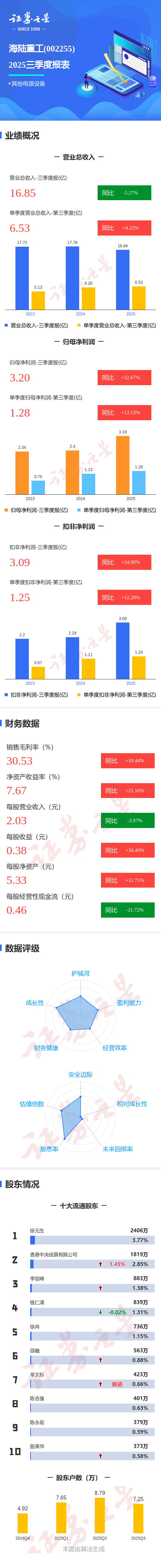证券之星消息,海陆重工2025年三季报显示,公司主营收入16.85亿元,同比下降5.27%;归母净利润3.2亿元,同比上升32.67%;扣非净利润3.09亿元,同比上升34.91%;其中2025年第三季度,公司单季度主营收入6.53亿元,同比上升4.23%;单季度归母净利润1.28亿元,同比上升13.13%;单季度扣非净利润1.25亿元,同比上升12.2%;负债率34.25%,投资收益242.82万元,财务费用-1524.25万元,毛利率30.53%。