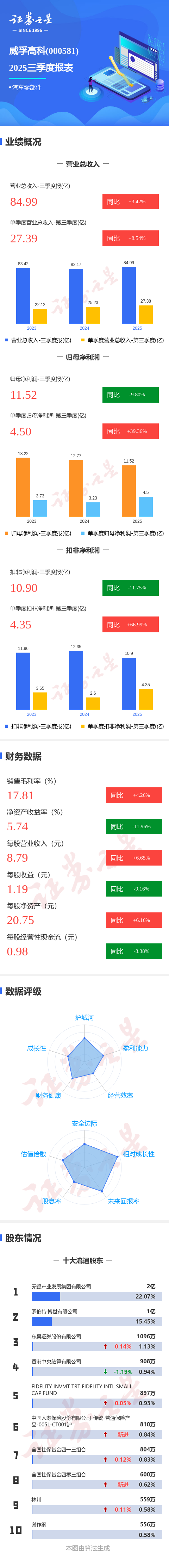 证券之星消息,威孚高科2025年三季报显示,公司主营收入84.99亿元,同比上升3.43%;归母净利润11.52亿元,同比下降9.81%;扣非净利润10.9亿元,同比下降11.75%;其中2025年第三季度,公司单季度主营收入27.39亿元,同比上升8.54%;单季度归母净利润4.5亿元,同比上升39.37%;单季度扣非净利润4.35亿元,同比上升67.0%;负债率27.81%,投资收益9.0亿元,财务费用-4227.77万元,毛利率17.81%。