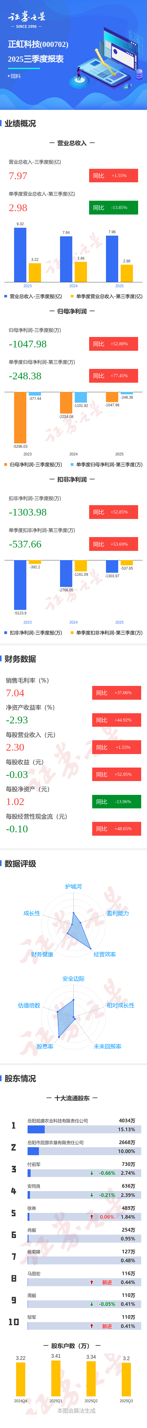 证券之星消息,正虹科技2025年三季报显示,公司主营收入7.97亿元,同比上升1.55%;归母净利润-1047.98万元,同比上升52.88%;扣非净利润-1303.98万元,同比上升52.86%;其中2025年第三季度,公司单季度主营收入2.98亿元,同比下降13.86%;单季度归母净利润-248.38万元,同比上升77.46%;单季度扣非净利润-537.66万元,同比上升53.69%;负债率41.99%,投资收益17.79万元,财务费用581.82万元,毛利率7.04%。