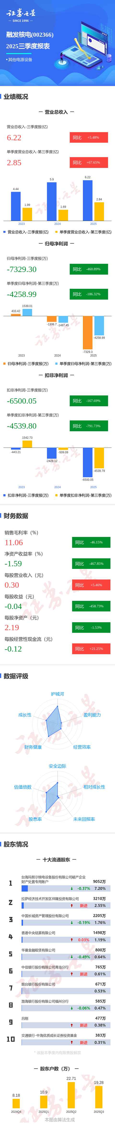 证券之星消息,融发核电2025年三季报显示,公司主营收入6.22亿元,同比上升5.49%;归母净利润-7329.3万元,同比下降460.9%;扣非净利润-6500.05万元,同比下降167.7%;其中2025年第三季度,公司单季度主营收入2.85亿元,同比上升67.65%;单季度归母净利润-4258.99万元,同比下降186.33%;单季度扣非净利润-4539.8万元,同比下降791.74%;负债率36.12%,投资收益-1650.56万元,财务费用1138.61万元,毛利率11.06%。