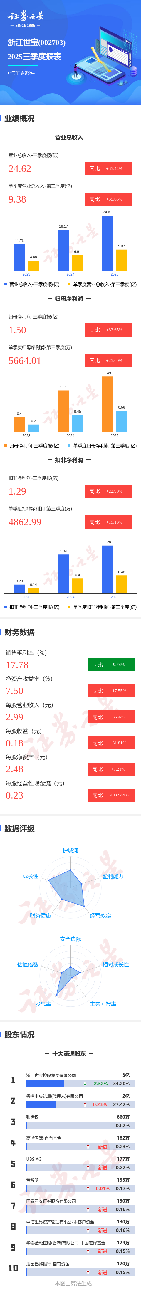 证券之星消息,浙江世宝2025年三季报显示,公司主营收入24.62亿元,同比上升35.44%;归母净利润1.5亿元,同比上升33.66%;扣非净利润1.29亿元,同比上升22.9%;其中2025年第三季度,公司单季度主营收入9.38亿元,同比上升35.65%;单季度归母净利润5664.01万元,同比上升25.6%;单季度扣非净利润4862.99万元,同比上升19.19%;负债率43.71%,投资收益259.46万元,财务费用14.99万元,毛利率17.78%。