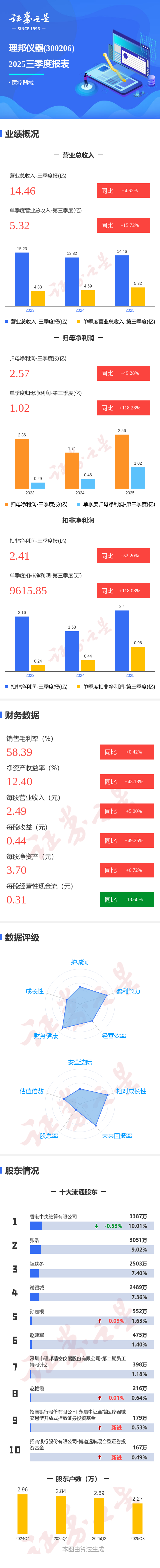 证券之星消息,理邦仪器2025年三季报显示,公司主营收入14.46亿元,同比上升4.63%;归母净利润2.57亿元,同比上升49.29%;扣非净利润2.41亿元,同比上升52.21%;其中2025年第三季度,公司单季度主营收入5.32亿元,同比上升15.72%;单季度归母净利润1.02亿元,同比上升118.28%;单季度扣非净利润9615.85万元,同比上升118.08%;负债率14.43%,投资收益195.35万元,财务费用-1136.75万元,毛利率58.39%。