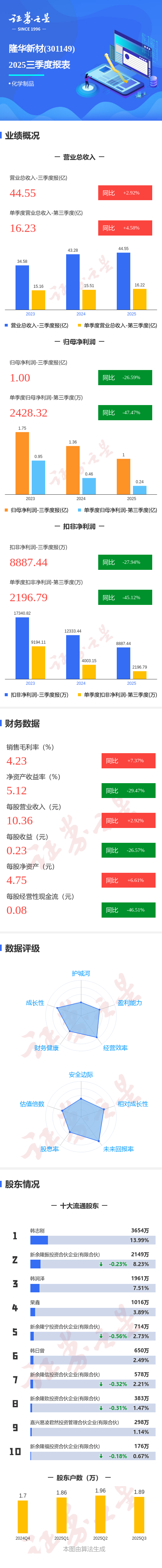 证券之星消息,隆华新材2025年三季报显示,公司主营收入44.55亿元,同比上升2.93%;归母净利润1.0亿元,同比下降26.6%;扣非净利润8887.44万元,同比下降27.94%;其中2025年第三季度,公司单季度主营收入16.23亿元,同比上升4.59%;单季度归母净利润2428.32万元,同比下降47.47%;单季度扣非净利润2196.79万元,同比下降45.12%;负债率34.01%,投资收益813.75万元,财务费用559.45万元,毛利率4.23%。