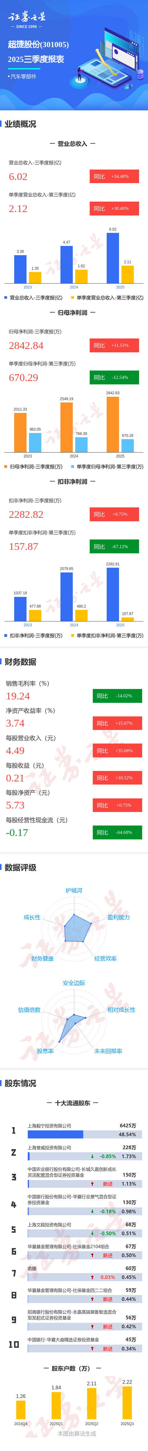 证券之星消息,超捷股份2025年三季报显示,公司主营收入6.02亿元,同比上升34.49%;归母净利润2842.84万元,同比上升11.52%;扣非净利润2282.82万元,同比上升9.76%;其中2025年第三季度,公司单季度主营收入2.12亿元,同比上升30.41%;单季度归母净利润670.29万元,同比下降12.54%;单季度扣非净利润157.87万元,同比下降67.12%;负债率37.8%,投资收益539.1万元,财务费用320.89万元,毛利率19.24%。