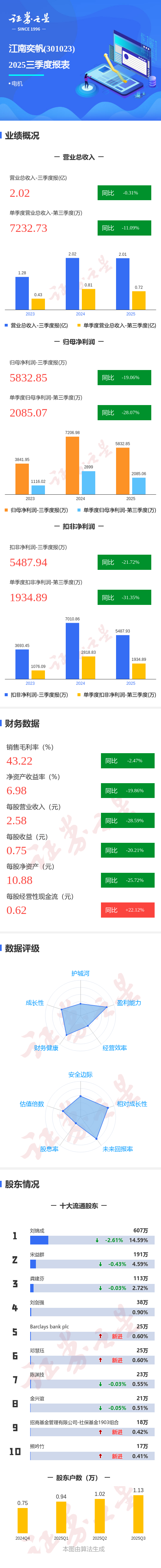 证券之星消息,江南奕帆2025年三季报显示,公司主营收入2.02亿元,同比下降0.31%;归母净利润5832.85万元,同比下降19.07%;扣非净利润5487.94万元,同比下降21.72%;其中2025年第三季度,公司单季度主营收入7232.73万元,同比下降11.09%;单季度归母净利润2085.07万元,同比下降28.08%;单季度扣非净利润1934.89万元,同比下降31.36%;负债率8.25%,投资收益469.5万元,财务费用-594.66万元,毛利率43.22%。