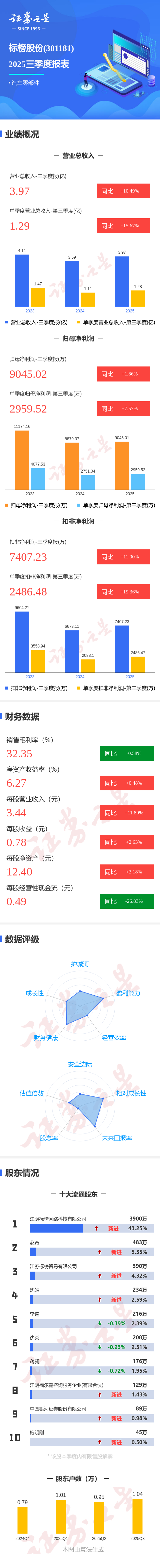 证券之星消息,标榜股份2025年三季报显示,公司主营收入3.97亿元,同比上升10.5%;归母净利润9045.02万元,同比上升1.87%;扣非净利润7407.23万元,同比上升11.0%;其中2025年第三季度,公司单季度主营收入1.29亿元,同比上升15.68%;单季度归母净利润2959.52万元,同比上升7.58%;单季度扣非净利润2486.48万元,同比上升19.36%;负债率12.29%,投资收益1615.07万元,财务费用-66.01万元,毛利率32.35%。
