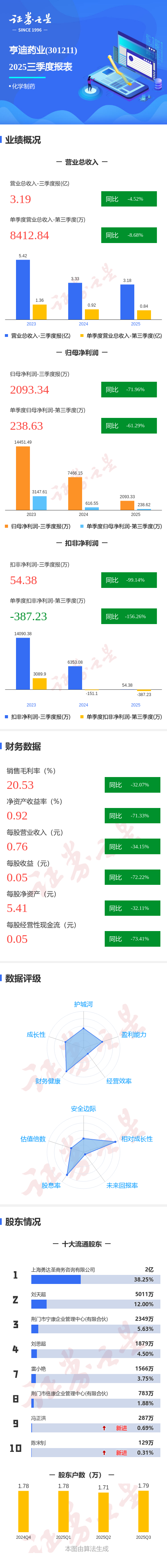 证券之星消息,亨迪药业2025年三季报显示,公司主营收入3.19亿元,同比下降4.52%;归母净利润2093.34万元,同比下降71.96%;扣非净利润54.38万元,同比下降99.14%;其中2025年第三季度,公司单季度主营收入8412.84万元,同比下降8.68%;单季度归母净利润238.63万元,同比下降61.3%;单季度扣非净利润-387.23万元,同比下降156.27%;负债率5.92%,投资收益471.52万元,财务费用-814.72万元,毛利率20.53%。