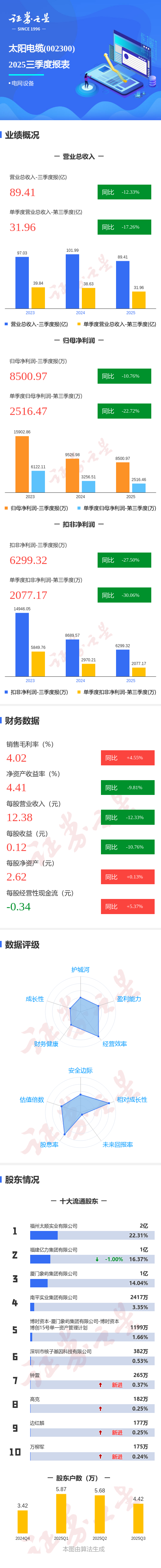 证券之星消息,太阳电缆2025年三季报显示,公司主营收入89.41亿元,同比下降12.33%;归母净利润8500.97万元,同比下降10.77%;扣非净利润6299.32万元,同比下降27.51%;其中2025年第三季度,公司单季度主营收入31.96亿元,同比下降17.27%;单季度归母净利润2516.47万元,同比下降22.73%;单季度扣非净利润2077.17万元,同比下降30.07%;负债率65.93%,投资收益866.54万元,财务费用3195.78万元,毛利率4.02%。