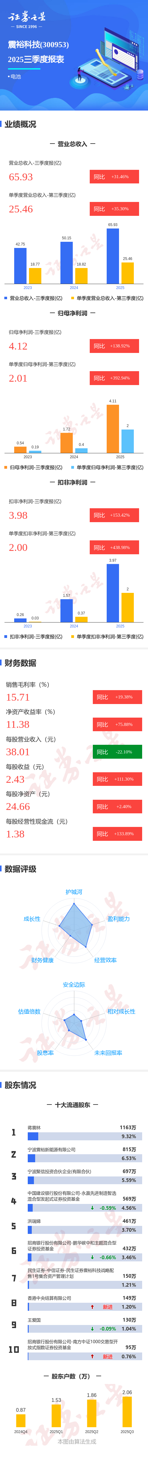证券之星消息,震裕科技2025年三季报显示,公司主营收入65.93亿元,同比上升31.47%;归母净利润4.12亿元,同比上升138.93%;扣非净利润3.98亿元,同比上升153.42%;其中2025年第三季度,公司单季度主营收入25.46亿元,同比上升35.3%;单季度归母净利润2.01亿元,同比上升392.95%;单季度扣非净利润2.0亿元,同比上升438.98%;负债率64.43%,投资收益528.02万元,财务费用9078.85万元,毛利率15.71%。