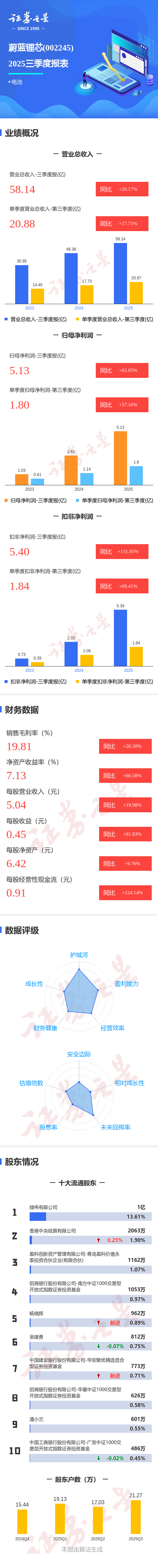 证券之星消息,蔚蓝锂芯2025年三季报显示,公司主营收入58.14亿元,同比上升20.17%;归母净利润5.13亿元,同比上升82.05%;扣非净利润5.4亿元,同比上升131.86%;其中2025年第三季度,公司单季度主营收入20.88亿元,同比上升17.72%;单季度归母净利润1.8亿元,同比上升57.17%;单季度扣非净利润1.84亿元,同比上升69.42%;负债率34.05%,投资收益746.09万元,财务费用1637.79万元,毛利率19.81%。