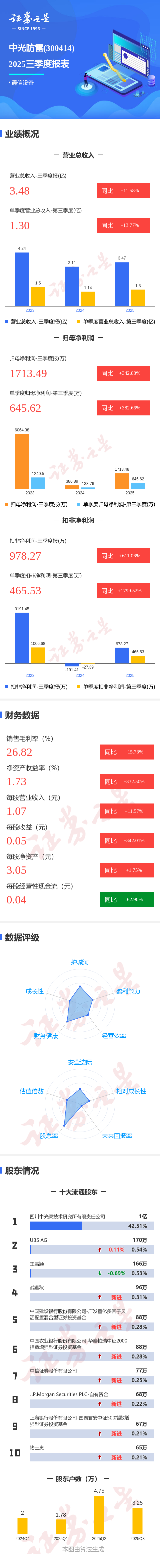 证券之星消息,中光防雷2025年三季报显示,公司主营收入3.48亿元,同比上升11.58%;归母净利润1713.49万元,同比上升342.89%;扣非净利润978.27万元,同比上升611.07%;其中2025年第三季度,公司单季度主营收入1.3亿元,同比上升13.78%;单季度归母净利润645.62万元,同比上升382.66%;单季度扣非净利润465.53万元,同比上升1799.52%;负债率17.75%,投资收益433.16万元,财务费用-266.23万元,毛利率26.82%。