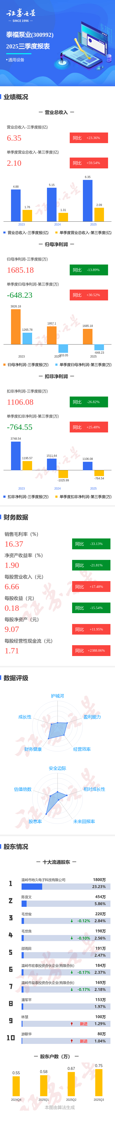 证券之星消息,泰福泵业2025年三季报显示,公司主营收入6.35亿元,同比上升23.36%;归母净利润1685.18万元,同比下降13.89%;扣非净利润1106.08万元,同比下降26.83%;其中2025年第三季度,公司单季度主营收入2.1亿元,同比上升59.55%;单季度归母净利润-648.23万元,同比上升30.53%;单季度扣非净利润-764.55万元,同比上升25.48%;负债率49.31%,投资收益420.35万元,财务费用-1011.51万元,毛利率16.36%。