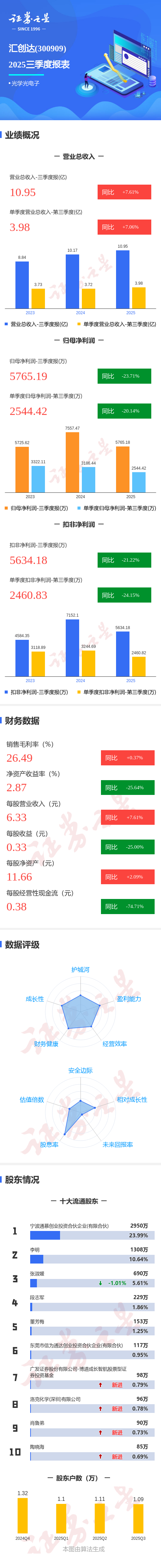 证券之星消息,汇创达2025年三季报显示,公司主营收入10.95亿元,同比上升7.62%;归母净利润5765.19万元,同比下降23.72%;扣非净利润5634.18万元,同比下降21.22%;其中2025年第三季度,公司单季度主营收入3.98亿元,同比上升7.07%;单季度归母净利润2544.42万元,同比下降20.15%;单季度扣非净利润2460.83万元,同比下降24.16%;负债率38.01%,投资收益35.34万元,财务费用1122.97万元,毛利率26.49%。