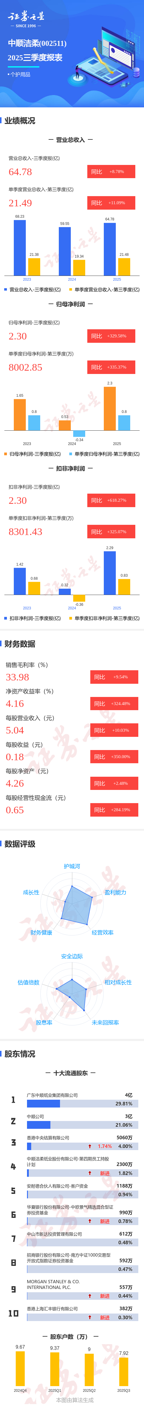 证券之星消息,中顺洁柔2025年三季报显示,公司主营收入64.78亿元,同比上升8.78%;归母净利润2.3亿元,同比上升329.59%;扣非净利润2.3亿元,同比上升618.28%;其中2025年第三季度,公司单季度主营收入21.49亿元,同比上升11.09%;单季度归母净利润8002.85万元,同比上升335.38%;单季度扣非净利润8301.43万元,同比上升325.07%;负债率39.96%,投资收益-74.02万元,财务费用2368.27万元,毛利率33.98%。