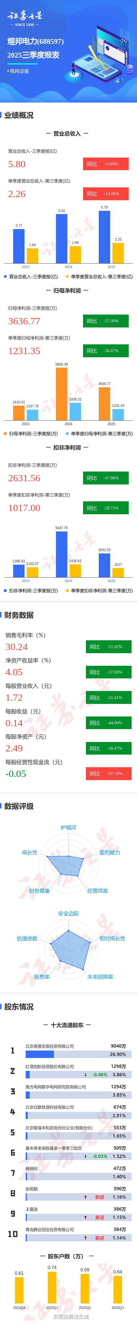 证券之星消息,煜邦电力2025年三季报显示,公司主营收入5.8亿元,同比上升6.9%;归母净利润3636.77万元,同比下降37.3%;扣非净利润2631.56万元,同比下降47.87%;其中2025年第三季度,公司单季度主营收入2.26亿元,同比上升19.07%;单季度归母净利润1231.35万元,同比下降36.07%;单季度扣非净利润1017.0万元,同比下降28.71%;负债率54.54%,投资收益451.52万元,财务费用1248.1万元,毛利率30.24%。