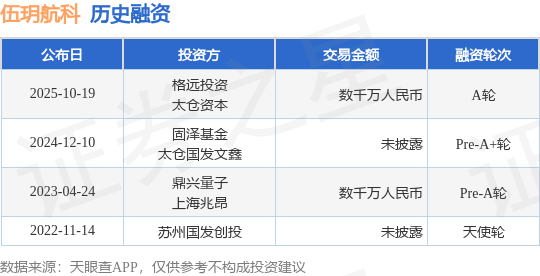 证券之星消息,根据天眼查APP于10月19日公布的信息整理,苏州伍玥航空科技有限公司A轮融资,融资额数千万人民币,参与投资的机构包括格远投资,太仓资本。