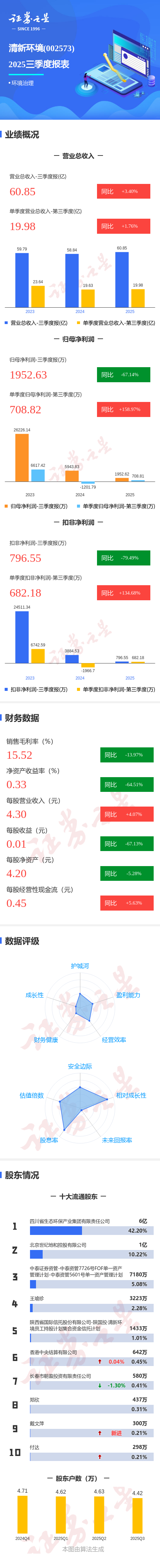 证券之星消息,清新环境2025年三季报显示,公司主营收入60.85亿元,同比上升3.41%;归母净利润1952.63万元,同比下降67.15%;扣非净利润796.55万元,同比下降79.49%;其中2025年第三季度,公司单季度主营收入19.98亿元,同比上升1.76%;单季度归母净利润708.82万元,同比上升158.98%;单季度扣非净利润682.18万元,同比上升134.69%;负债率69.45%,投资收益7902.05万元,财务费用3.02亿元,毛利率15.52%。