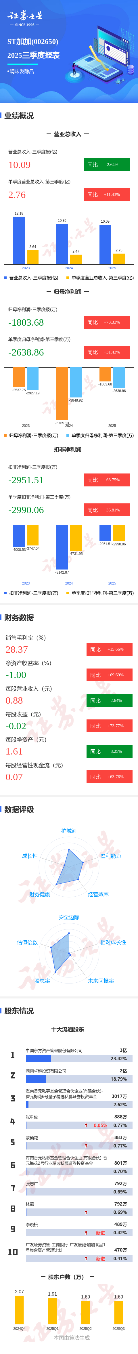 证券之星消息,ST加加2025年三季报显示,公司主营收入10.09亿元,同比下降2.65%;归母净利润-1803.68万元,同比上升73.34%;扣非净利润-2951.51万元,同比上升63.75%;其中2025年第三季度,公司单季度主营收入2.76亿元,同比上升11.43%;单季度归母净利润-2638.86万元,同比上升31.44%;单季度扣非净利润-2990.06万元,同比上升36.81%;负债率14.85%,投资收益160.35万元,财务费用115.66万元,毛利率28.37%。