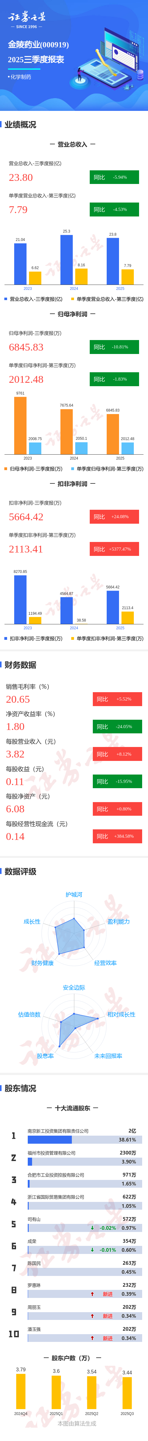 证券之星消息,金陵药业2025年三季报显示,公司主营收入23.8亿元,同比下降5.95%;归母净利润6845.83万元,同比下降10.81%;扣非净利润5664.42万元,同比上升24.09%;其中2025年第三季度,公司单季度主营收入7.79亿元,同比下降4.53%;单季度归母净利润2012.48万元,同比下降1.84%;单季度扣非净利润2113.41万元,同比上升5377.48%;负债率19.54%,投资收益1352.12万元,财务费用-698.01万元,毛利率20.65%。
