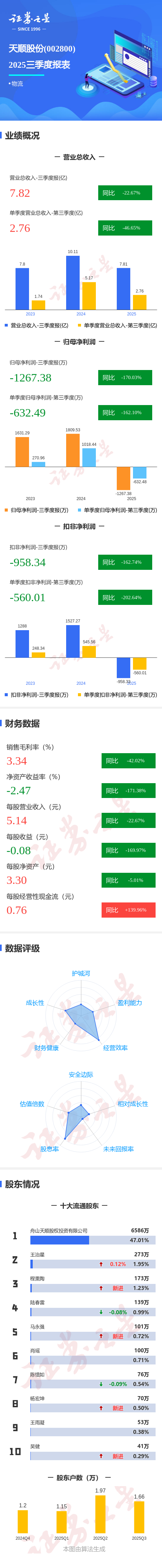 证券之星消息,天顺股份2025年三季报显示,公司主营收入7.82亿元,同比下降22.67%;归母净利润-1267.38万元,同比下降170.04%;扣非净利润-958.34万元,同比下降162.75%;其中2025年第三季度,公司单季度主营收入2.76亿元,同比下降46.66%;单季度归母净利润-632.49万元,同比下降162.1%;单季度扣非净利润-560.01万元,同比下降202.65%;负债率50.62%,投资收益378.26万元,财务费用1101.18万元,毛利率3.34%。