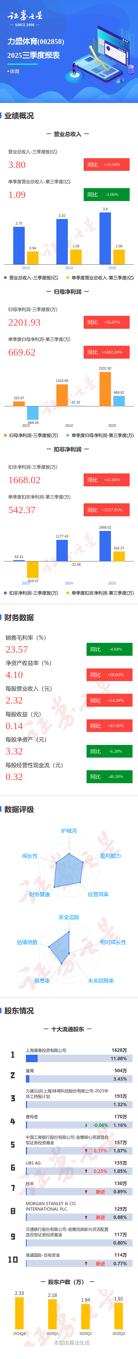 证券之星消息,力盛体育2025年三季报显示,公司主营收入3.8亿元,同比上升14.34%;归母净利润2201.93万元,同比上升56.07%;扣非净利润1668.02万元,同比上升41.67%;其中2025年第三季度,公司单季度主营收入1.09亿元,同比下降1.07%;单季度归母净利润669.62万元,同比上升1482.24%;单季度扣非净利润542.37万元,同比上升2557.91%;负债率35.63%,投资收益-162.04万元,财务费用882.86万元,毛利率23.57%。