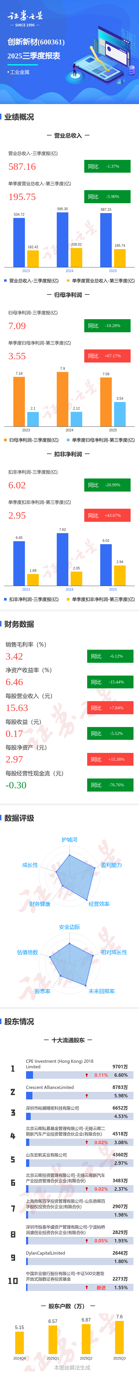 证券之星消息,创新新材2025年三季报显示,公司主营收入587.16亿元,同比下降1.38%;归母净利润7.09亿元,同比下降10.28%;扣非净利润6.02亿元,同比下降21.0%;其中2025年第三季度,公司单季度主营收入195.75亿元,同比下降5.9%;单季度归母净利润3.55亿元,同比上升67.17%;单季度扣非净利润2.95亿元,同比上升43.67%;负债率60.2%,投资收益-286.66万元,财务费用3.3亿元,毛利率3.42%。