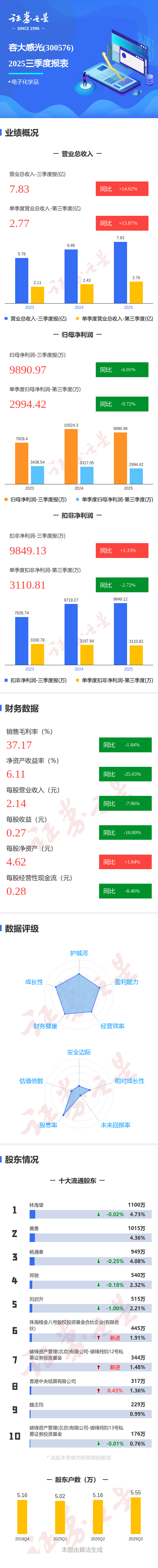 证券之星消息,容大感光2025年三季报显示,公司主营收入7.83亿元,同比上升14.02%;归母净利润9890.97万元,同比下降6.02%;扣非净利润9849.13万元,同比上升1.34%;其中2025年第三季度,公司单季度主营收入2.77亿元,同比上升13.88%;单季度归母净利润2994.42万元,同比下降9.73%;单季度扣非净利润3110.81万元,同比下降2.72%;负债率17.51%,投资收益-95.54万元,财务费用-380.9万元,毛利率37.17%。