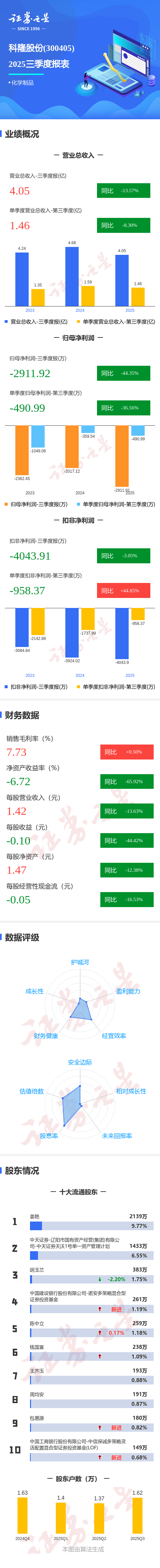 证券之星消息,科隆股份2025年三季报显示,公司主营收入4.05亿元,同比下降13.57%;归母净利润-2911.92万元,同比下降44.36%;扣非净利润-4043.91万元,同比下降3.06%;其中2025年第三季度,公司单季度主营收入1.46亿元,同比下降8.3%;单季度归母净利润-490.99万元,同比下降36.56%;单季度扣非净利润-958.37万元,同比上升44.86%;负债率58.29%,投资收益-220.01万元,财务费用1405.43万元,毛利率7.73%。