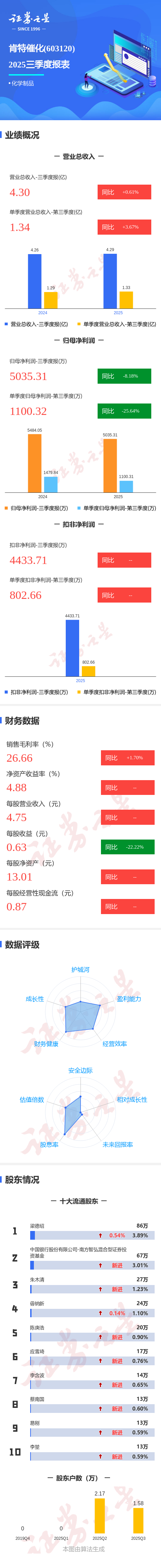 证券之星消息,肯特催化2025年三季报显示,公司主营收入4.3亿元,同比上升0.62%;归母净利润5035.31万元,同比下降8.18%;扣非净利润4433.71万元,其中2025年第三季度,公司单季度主营收入1.34亿元,同比上升3.67%;单季度归母净利润1100.32万元,同比下降25.65%;单季度扣非净利润802.66万元,负债率13.05%,财务费用-165.14万元,毛利率26.66%。
