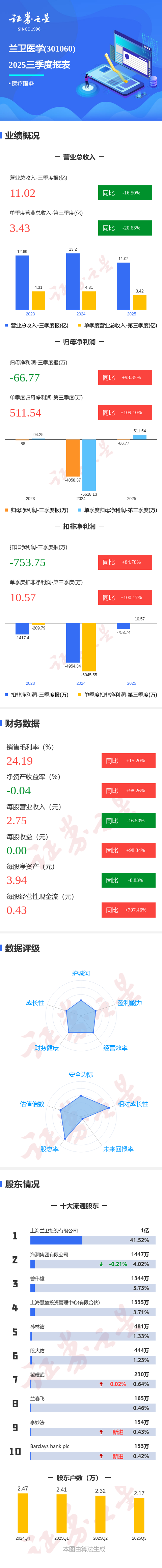 证券之星消息,兰卫医学2025年三季报显示,公司主营收入11.02亿元,同比下降16.51%;归母净利润-66.77万元,同比上升98.35%;扣非净利润-753.75万元,同比上升84.79%;其中2025年第三季度,公司单季度主营收入3.43亿元,同比下降20.63%;单季度归母净利润511.54万元,同比上升109.11%;单季度扣非净利润10.57万元,同比上升100.17%;负债率31.28%,投资收益-76.79万元,财务费用219.35万元,毛利率24.19%。