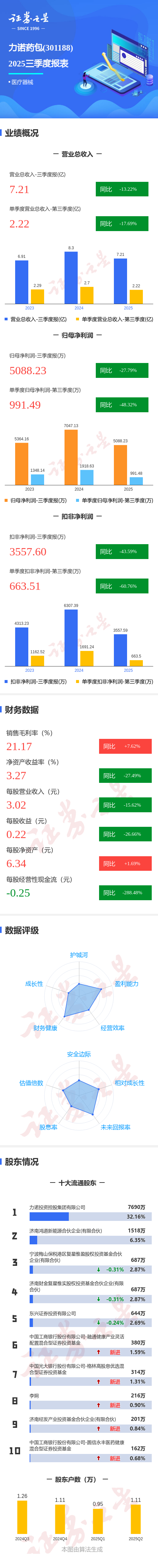 证券之星消息,力诺药包2025年三季报显示,公司主营收入7.21亿元,同比下降13.22%;归母净利润5088.23万元,同比下降27.8%;扣非净利润3557.6万元,同比下降43.6%;其中2025年第三季度,公司单季度主营收入2.22亿元,同比下降17.69%;单季度归母净利润991.49万元,同比下降48.32%;单季度扣非净利润663.51万元,同比下降60.77%;负债率37.36%,投资收益655.07万元,财务费用1723.87万元,毛利率21.17%。