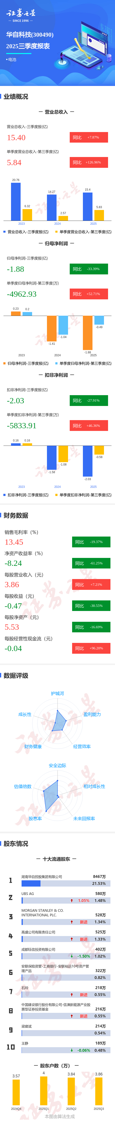 证券之星消息,华自科技2025年三季报显示,公司主营收入15.4亿元,同比上升7.88%;归母净利润-1.88亿元,同比下降33.39%;扣非净利润-2.03亿元,同比下降27.92%;其中2025年第三季度,公司单季度主营收入5.84亿元,同比上升126.96%;单季度归母净利润-4962.93万元,同比上升52.71%;单季度扣非净利润-5833.91万元,同比上升46.36%;负债率68.57%,投资收益397.19万元,财务费用3433.39万元,毛利率13.45%。