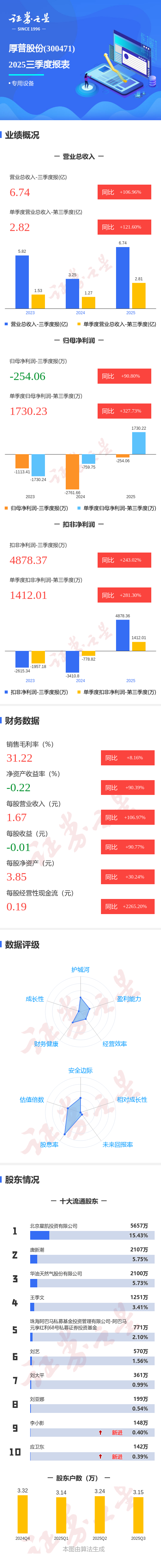 证券之星消息,厚普股份2025年三季报显示,公司主营收入6.74亿元,同比上升106.97%;归母净利润-254.06万元,同比上升90.8%;扣非净利润4878.37万元,同比上升243.03%;其中2025年第三季度,公司单季度主营收入2.82亿元,同比上升121.61%;单季度归母净利润1730.23万元,同比上升327.73%;单季度扣非净利润1412.01万元,同比上升281.3%;负债率44.0%,投资收益-188.41万元,财务费用446.53万元,毛利率31.22%。