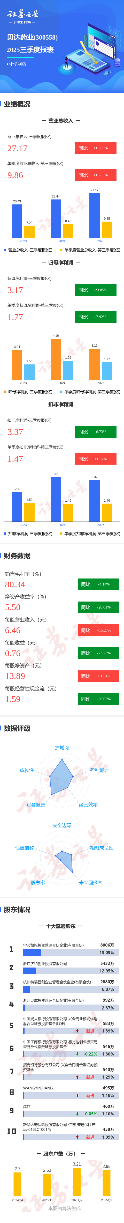 证券之星消息,贝达药业2025年三季报显示,公司主营收入27.17亿元,同比上升15.9%;归母净利润3.17亿元,同比下降23.86%;扣非净利润3.37亿元,同比下降6.74%;其中2025年第三季度,公司单季度主营收入9.86亿元,同比上升16.83%;单季度归母净利润1.77亿元,同比下降7.93%;单季度扣非净利润1.47亿元,同比上升1.08%;负债率38.97%,投资收益-991.13万元,财务费用6158.65万元,毛利率80.34%。