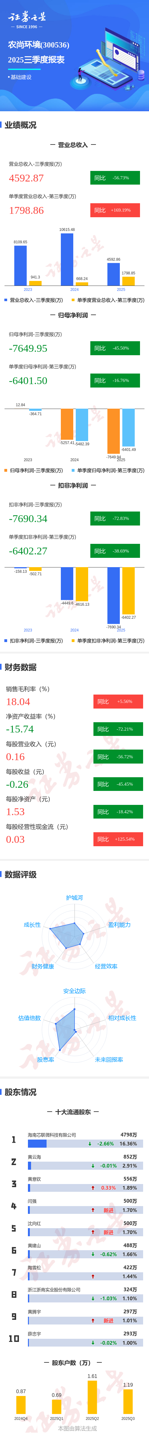 证券之星消息,农尚环境2025年三季报显示,公司主营收入4592.87万元,同比下降56.73%;归母净利润-7649.95万元,同比下降45.51%;扣非净利润-7690.34万元,同比下降72.83%;其中2025年第三季度,公司单季度主营收入1798.86万元,同比上升169.19%;单季度归母净利润-6401.5万元,同比下降16.76%;单季度扣非净利润-6402.27万元,同比下降38.69%;负债率43.81%,财务费用95.51万元,毛利率18.04%。