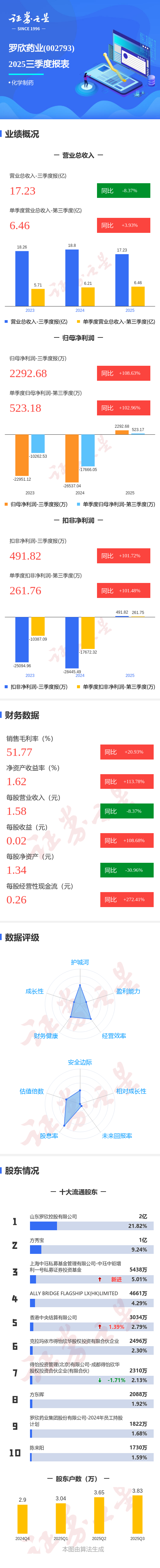 证券之星消息,罗欣药业2025年三季报显示,公司主营收入17.23亿元,同比下降8.37%;归母净利润2292.68万元,同比上升108.64%;扣非净利润491.82万元,同比上升101.73%;其中2025年第三季度,公司单季度主营收入6.46亿元,同比上升3.94%;单季度归母净利润523.18万元,同比上升102.96%;单季度扣非净利润261.76万元,同比上升101.48%;负债率61.65%,投资收益-439.44万元,财务费用4692.1万元,毛利率51.77%。