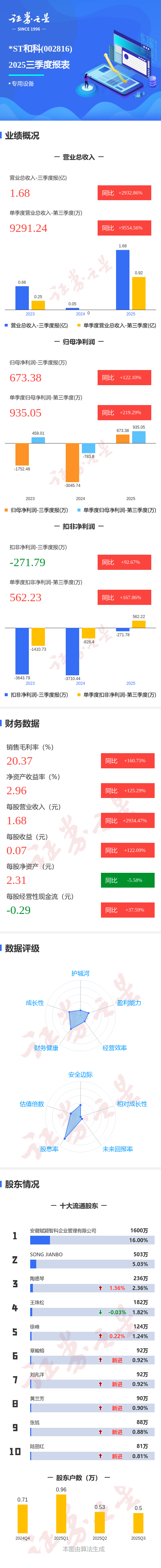 证券之星消息,*ST和科2025年三季报显示,公司主营收入1.68亿元,同比上升2932.86%;归母净利润673.38万元,同比上升122.11%;扣非净利润-271.79万元,同比上升92.68%;其中2025年第三季度,公司单季度主营收入9291.24万元,同比上升9554.56%;单季度归母净利润935.05万元,同比上升219.3%;单季度扣非净利润562.23万元,同比上升167.87%;负债率48.45%,投资收益-57.4万元,财务费用107.36万元,毛利率20.37%。