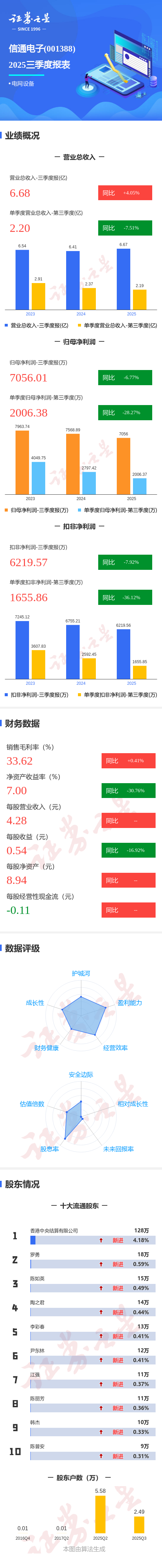 证券之星消息,信通电子2025年三季报显示,公司主营收入6.68亿元,同比上升4.05%;归母净利润7056.01万元,同比下降6.78%;扣非净利润6219.57万元,同比下降7.93%;其中2025年第三季度,公司单季度主营收入2.2亿元,同比下降7.51%;单季度归母净利润2006.38万元,同比下降28.28%;单季度扣非净利润1655.86万元,同比下降36.13%;负债率30.32%,投资收益468.95万元,财务费用-51.93万元,毛利率33.62%。
