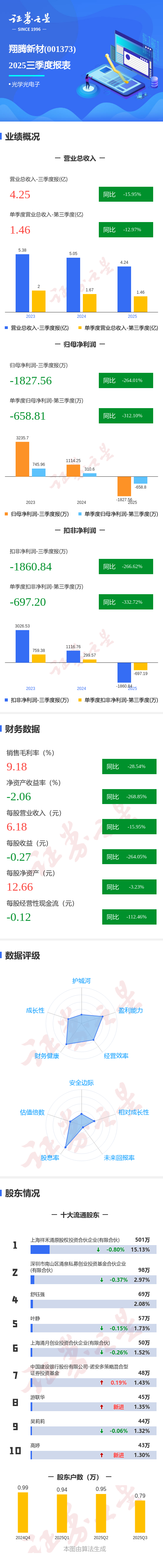 证券之星消息,翔腾新材2025年三季报显示,公司主营收入4.25亿元,同比下降15.95%;归母净利润-1827.56万元,同比下降264.02%;扣非净利润-1860.84万元,同比下降266.63%;其中2025年第三季度,公司单季度主营收入1.46亿元,同比下降12.97%;单季度归母净利润-658.81万元,同比下降312.11%;单季度扣非净利润-697.2万元,同比下降332.73%;负债率10.62%,投资收益18.56万元,财务费用37.73万元,毛利率9.18%。