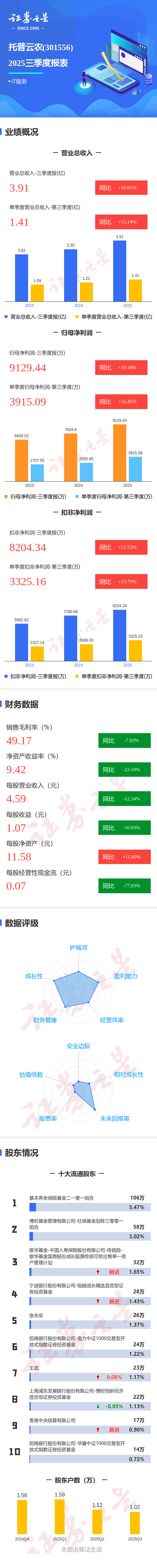 证券之星消息,托普云农2025年三季报显示,公司主营收入3.91亿元,同比上升16.61%;归母净利润9129.44万元,同比上升19.19%;扣非净利润8204.34万元,同比上升12.53%;其中2025年第三季度,公司单季度主营收入1.41亿元,同比上升15.15%;单季度归母净利润3915.09万元,同比上升32.45%;单季度扣非净利润3325.16万元,同比上升23.79%;负债率17.59%,投资收益0.0万元,财务费用-1207.52万元,毛利率49.17%。