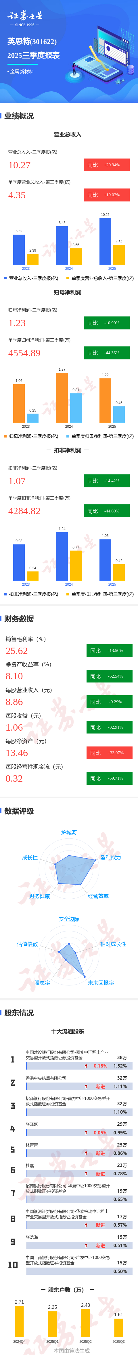 证券之星消息,英思特2025年三季报显示,公司主营收入10.27亿元,同比上升20.94%;归母净利润1.23亿元,同比下降10.9%;扣非净利润1.07亿元,同比下降14.43%;其中2025年第三季度,公司单季度主营收入4.35亿元,同比上升19.03%;单季度归母净利润4554.89万元,同比下降44.36%;单季度扣非净利润4284.82万元,同比下降44.69%;负债率36.16%,投资收益203.09万元,财务费用487.03万元,毛利率25.62%。