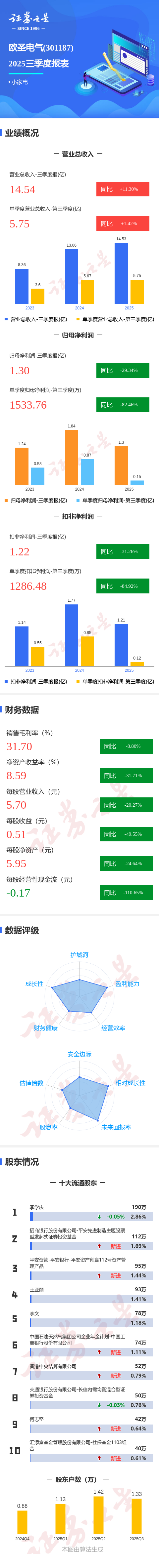证券之星消息,欧圣电气2025年三季报显示,公司主营收入14.54亿元,同比上升11.3%;归母净利润1.3亿元,同比下降29.34%;扣非净利润1.22亿元,同比下降31.26%;其中2025年第三季度,公司单季度主营收入5.75亿元,同比上升1.42%;单季度归母净利润1533.76万元,同比下降82.47%;单季度扣非净利润1286.48万元,同比下降84.92%;负债率60.75%,投资收益278.79万元,财务费用-727.42万元,毛利率31.7%。