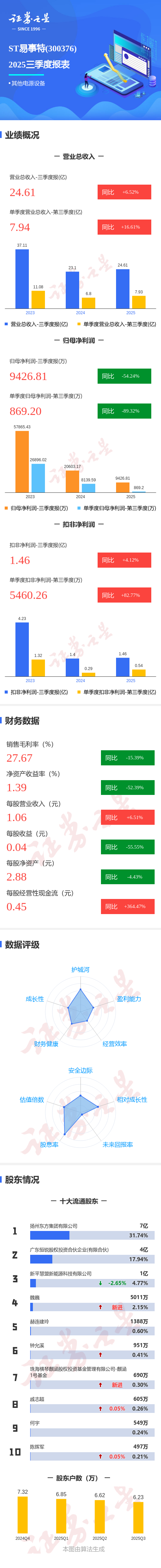 证券之星消息,ST易事特2025年三季报显示,公司主营收入24.61亿元,同比上升6.52%;归母净利润9426.81万元,同比下降54.25%;扣非净利润1.46亿元,同比上升4.13%;其中2025年第三季度,公司单季度主营收入7.94亿元,同比上升16.62%;单季度归母净利润869.2万元,同比下降89.32%;单季度扣非净利润5460.26万元,同比上升82.77%;负债率48.66%,投资收益-134.05万元,财务费用4537.32万元,毛利率27.67%。