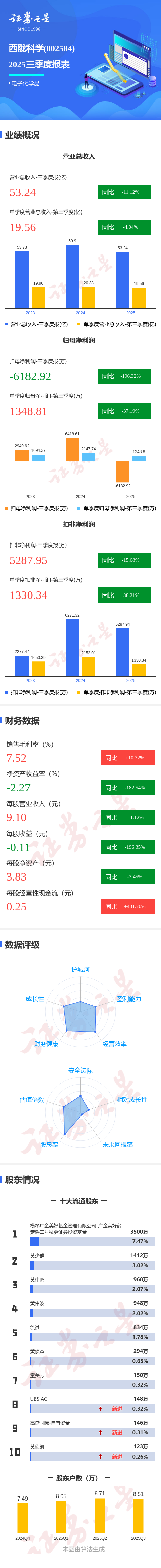 证券之星消息,西陇科学2025年三季报显示,公司主营收入53.24亿元,同比下降11.13%;归母净利润-6182.92万元,同比下降196.33%;扣非净利润5287.95万元,同比下降15.68%;其中2025年第三季度,公司单季度主营收入19.56亿元,同比下降4.05%;单季度归母净利润1348.81万元,同比下降37.2%;单季度扣非净利润1330.34万元,同比下降38.21%;负债率56.3%,投资收益-721.57万元,财务费用4862.27万元,毛利率7.52%。