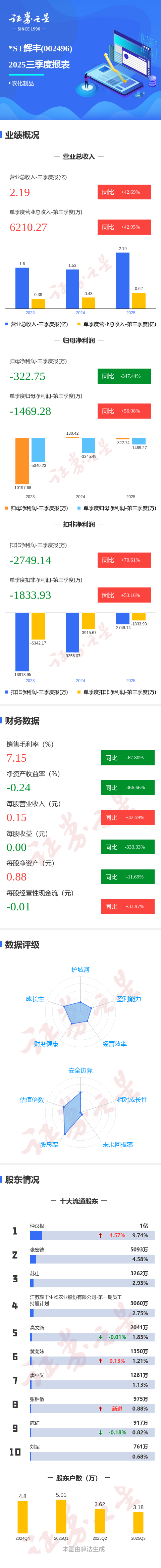 证券之星消息,*ST辉丰2025年三季报显示,公司主营收入2.19亿元,同比上升42.7%;归母净利润-322.75万元,同比下降347.45%;扣非净利润-2749.14万元,同比上升70.62%;其中2025年第三季度,公司单季度主营收入6210.27万元,同比上升42.95%;单季度归母净利润-1469.28万元,同比上升56.08%;单季度扣非净利润-1833.93万元,同比上升53.16%;负债率43.56%,投资收益4915.81万元,财务费用1378.73万元,毛利率7.15%。